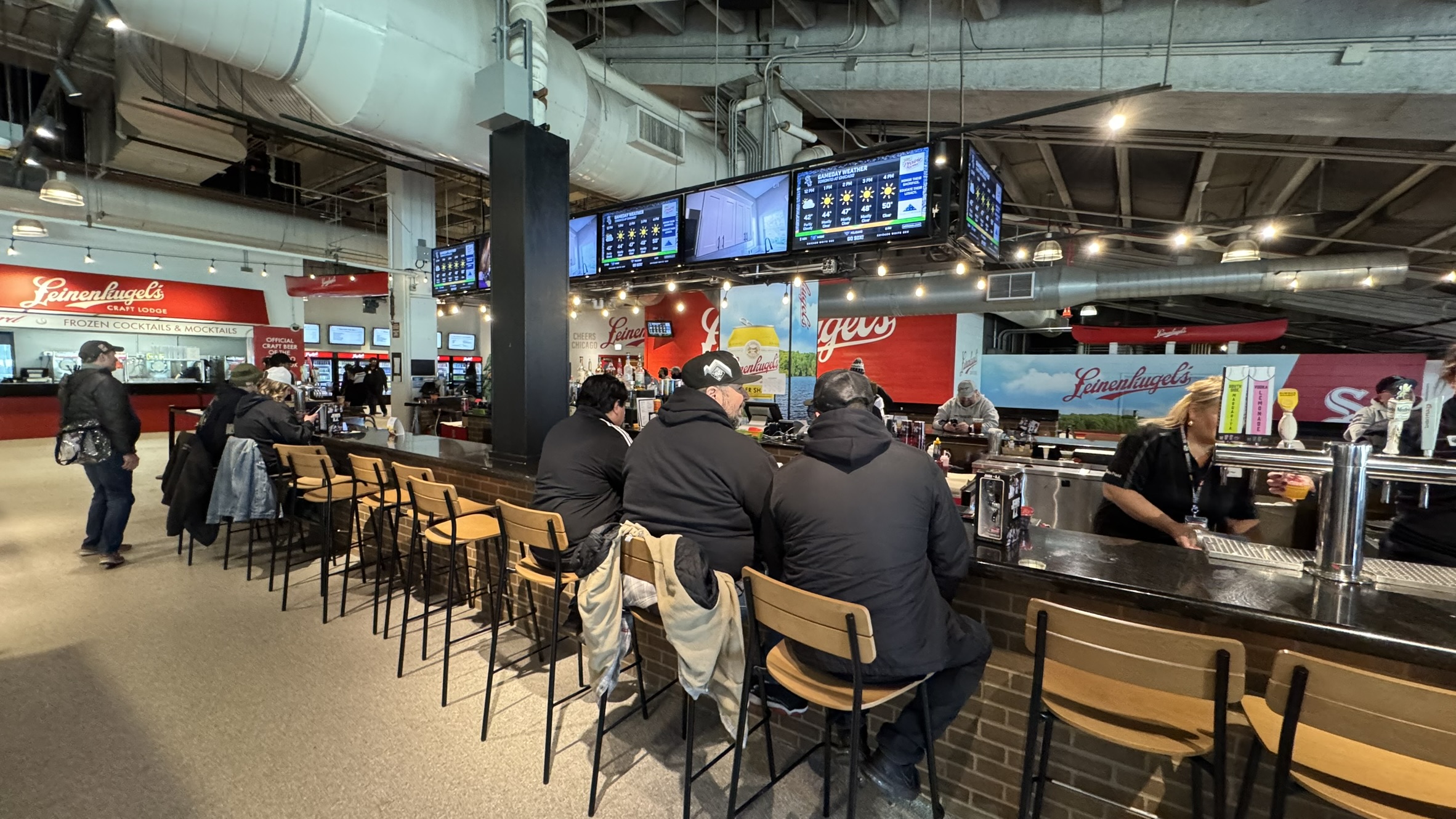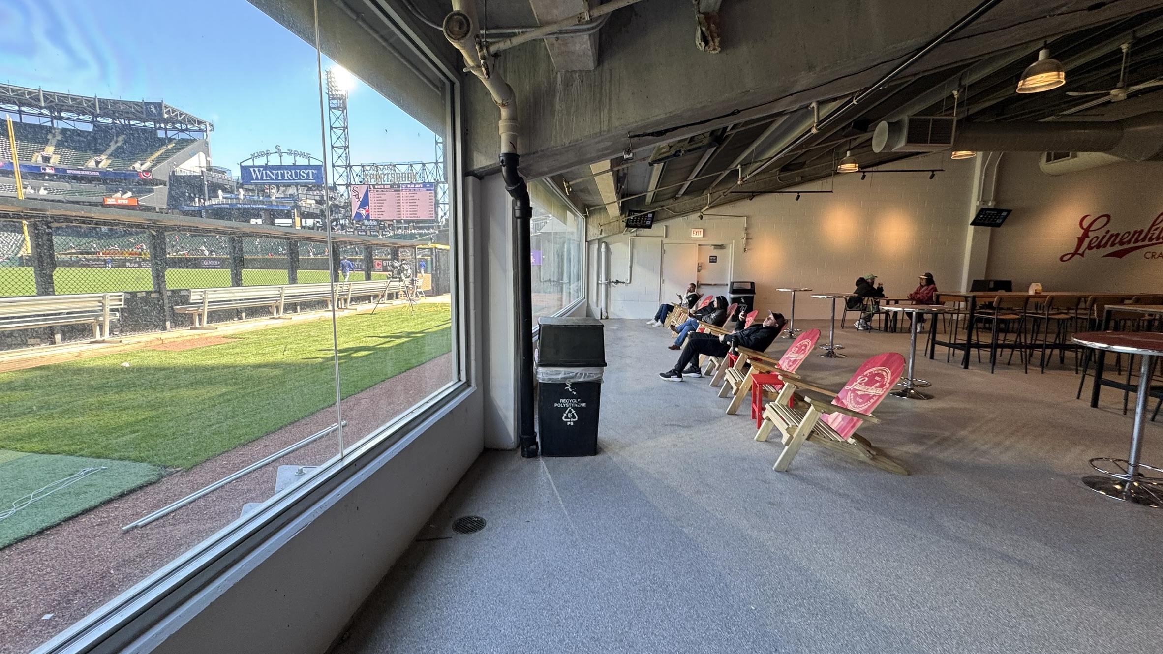 Located in the outfield of the ballpark, underneath the Miller Lite Landing, is the Leinenkugel Craft Lodge. It’s a huge bar with plenty of tables, and an impressive selection of more than 75 different beers, seltzers, ciders, etc. You can’t see the game from the bar area, but the Sox put out new (general admission) Adirondack chairs behind the visitors bullpen that you can “sort of” see the game from (for an inning or two — it’s not someplace we’d watch the whole game from). But you can look directly out to the visitors’ bullpen, which is pretty cool.